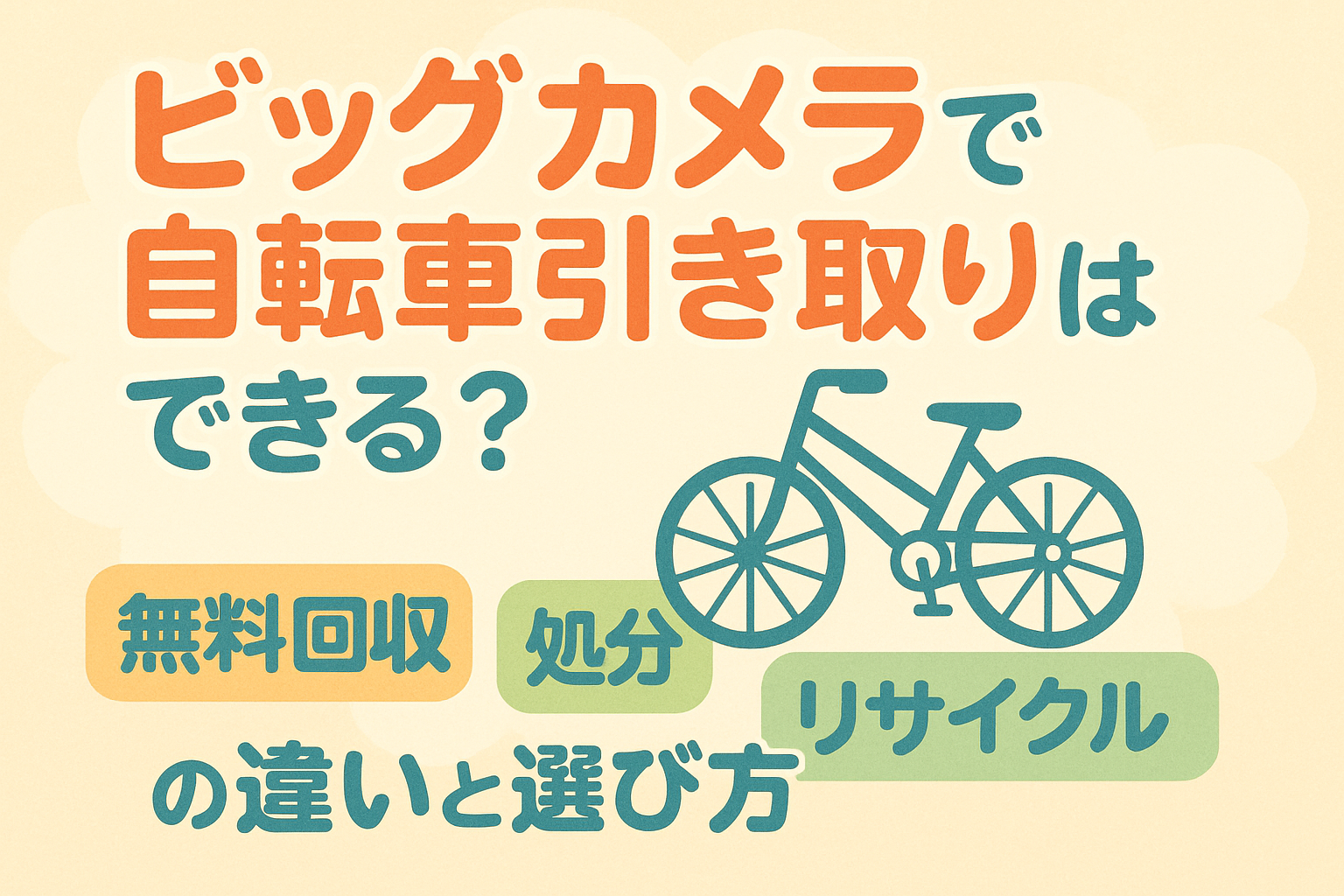 この記事では、ビックカメラで自転車引き取りができる可能性と、無料回収・処分・リサイクルの違いをやさしく整理します。