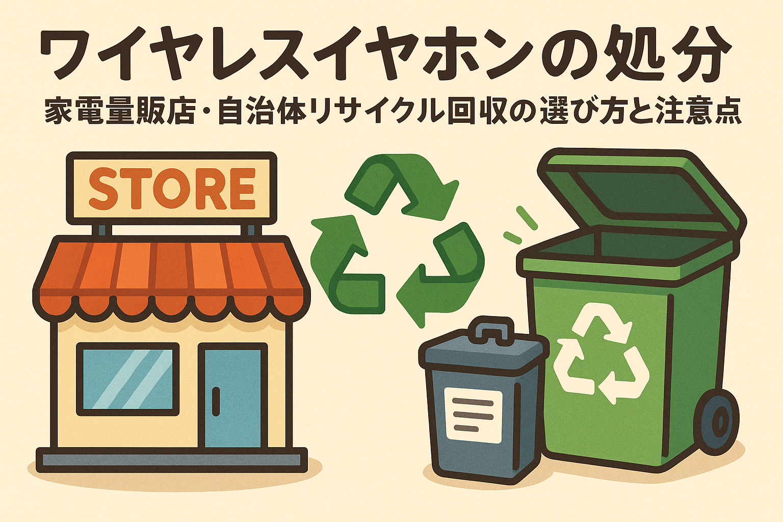 この記事では、「ワイヤレスイヤホンの処分|家電量販店・自治体リサイクル回収の選び方と注意点」というタイトルのとおり、両方のメリット・注意点をバランスよく紹介していきます。